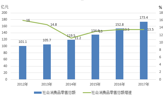 图5 2012年-2017年社会消费品零售总额及增速