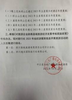 通过旅游主管部门搭建舞台,制定奖励政策并耐心细致的辅导,我县星级酒店、星级农家乐在2023年中对标经营,维护了国家标准、行业标准的权威,提高了服务质量,在社会同行业中树立了优秀的标杆作用,得到了社会对标准的认可。全县旅行社积极引流入中江县行政区内景区开展旅游活动,为县域内旅游活动注入了活力,带动了景区及周边产业的消费,在助推县域旅游经济发展工作中做出了杰出贡献。2023年11月,符合《对旅游企业助推县域旅游经济发展考核奖励政策》申报条件的旅行社、星级酒店、星级农家乐向中江县文化广播电视和旅游局提交了奖励申报材料,获得了相应的奖励。