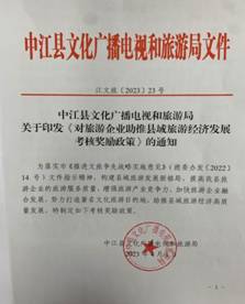 在中江千年一面景区争创国家3A级景区,石林谷初见雏形,继光湖生态康养旅游区加快建设的反向压力之下,结合我县旅游饭店、星级农家乐经营设施设备陈旧,先进经营理念缺乏,旅行社及分社没有一家发挥地接社作用。居于此,中江县文化广播电视和旅游局迎难而上提品质、补短板,为了中江旅游做强品牌效益、做大带动效益、做优集群效益,不断增强竞争力、创新力、影响力,2023年4月,制定出台了《对旅游企业助推县域旅游经济发展考核奖励政策》。