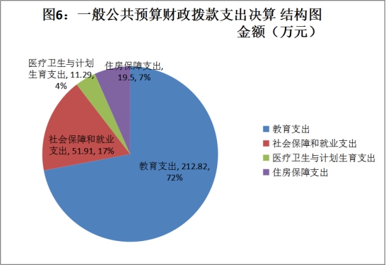 2018年一般公共预算财政拨款支出295.52万元,主要用于以下方面:教育支出212.82万元,占72.02%;社会保障和就业支出51.91万元,占17.57%;医疗卫生支出11.29万元,占3.82%;住房保障支出19.50万元,占6.60%。(详见图6:一般公共预算财政拨款支出决算结构图)